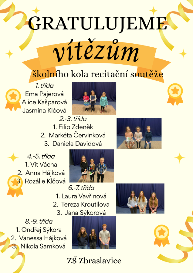 Letošní školní kolo recitační soutěže přineslo krásné zážitky a ukázalo, že mezi našimi žáky je mnoho talentovaných a odvážných mladých recitátorů. Všichni, kteří se rozhodli vystoupit před porotou i spolužáky, projevili velkou dávku odvahy, odhodlání a chuti překonat sami sebe. Bylo vidět, že si na svých vystoupeních dali záležet a že do nich dali kus sebe.
