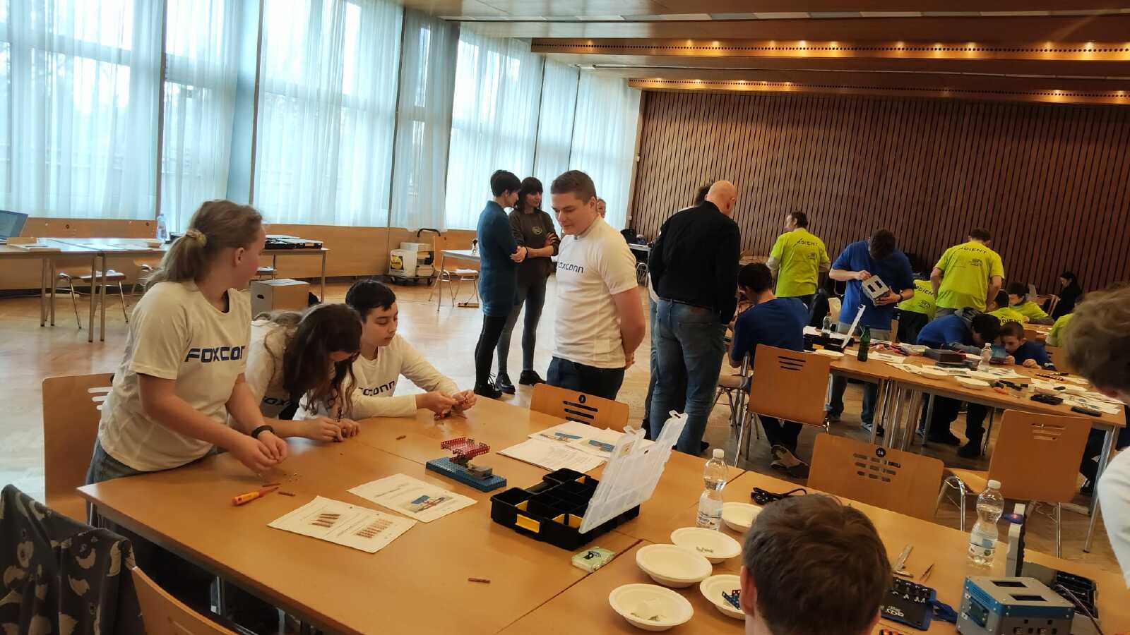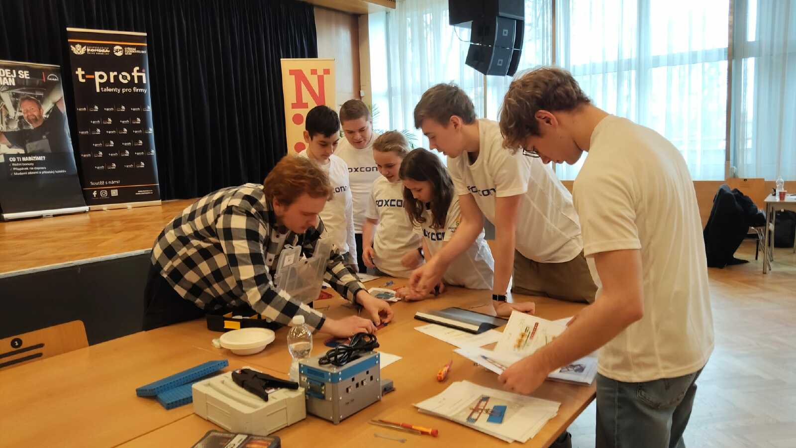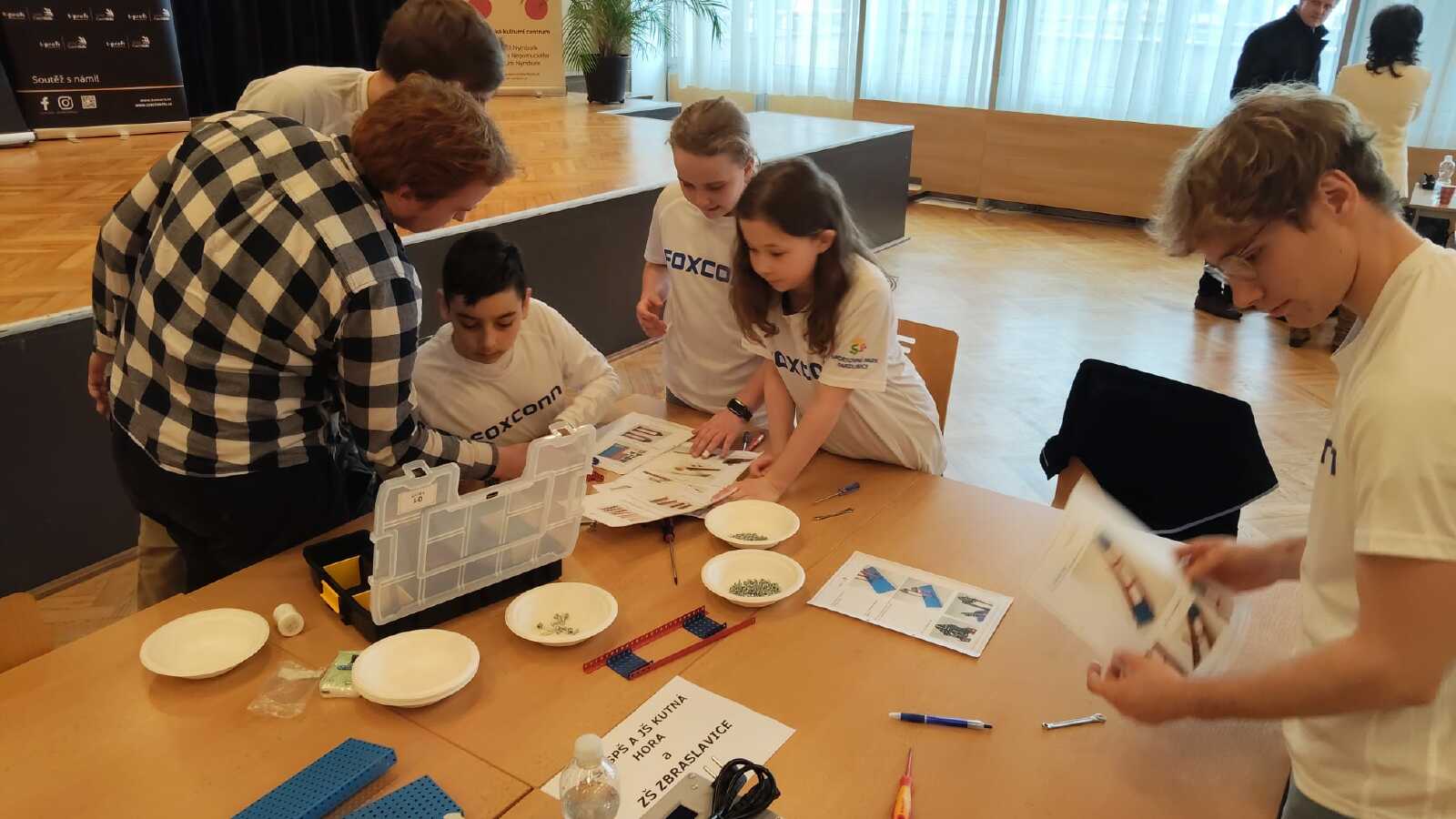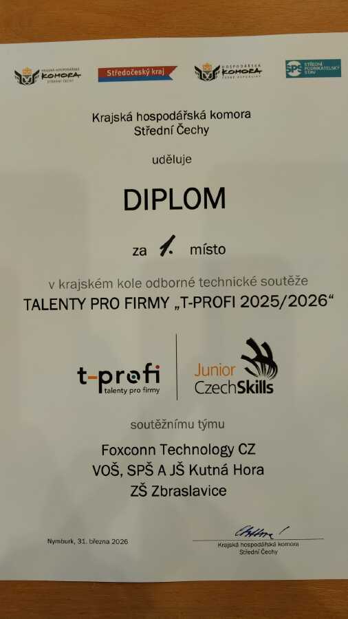 Skupina žáků 5. třídy naší školy dosáhla mimořádného úspěchu v krajském kole technicky zaměřené soutěže T-profi, která propojuje žáky základních a středních škol s odborníky z významných firem. Smíšené týmy ZŠ a SŠ měly za úkol během dvou hodin postavit a uvést do provozu funkční model skutečného zařízení. Zatímco mladší žáci pečlivě pracovali na konstrukci staveb ze stavebnice Merkur, jejich starší spolužáci paralelně vytvářeli pohonnou jednotku. Díky perfektní spolupráci všech členů týmu odevzdali svoji stavbu jako první ze všech zúčastněných a přesnost provedení jim vynesla první místo!!