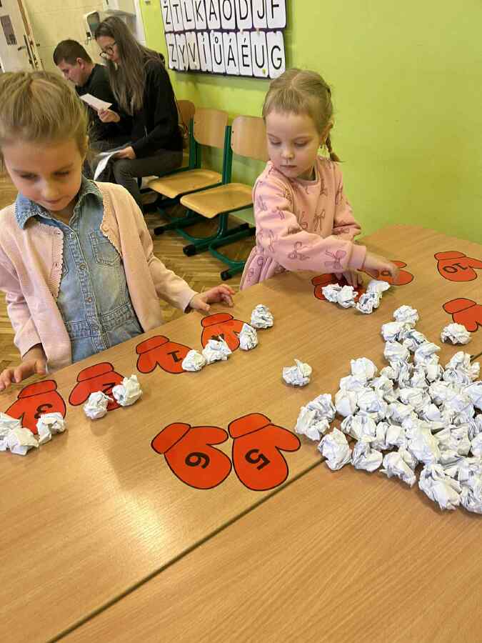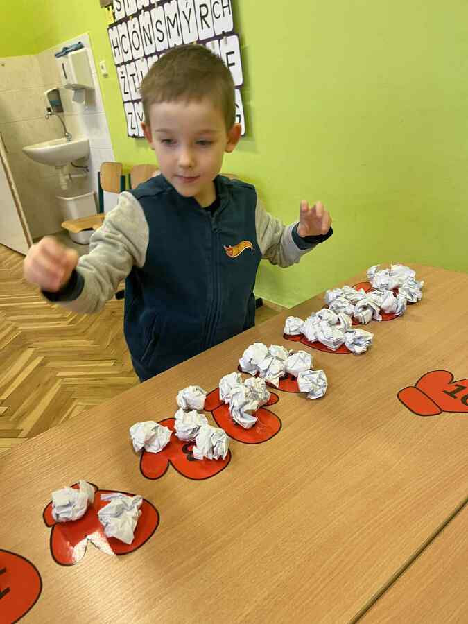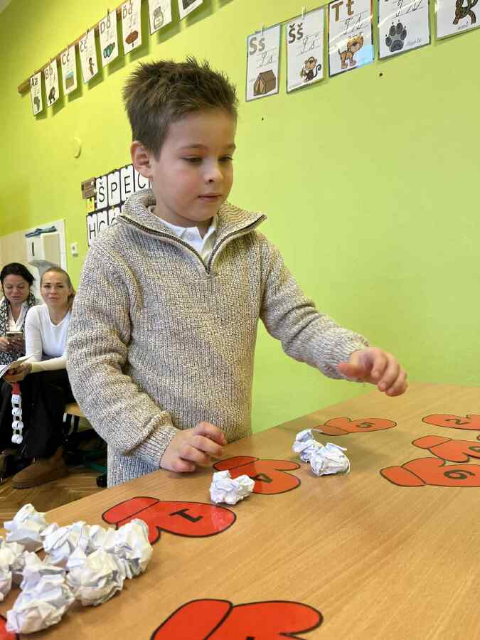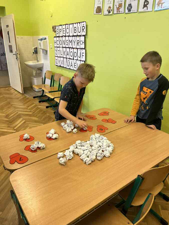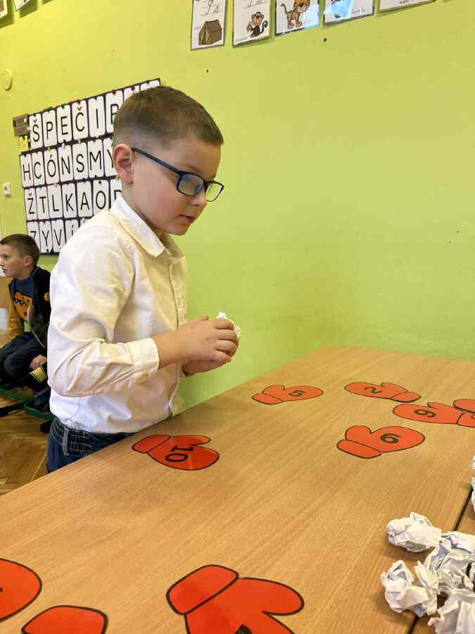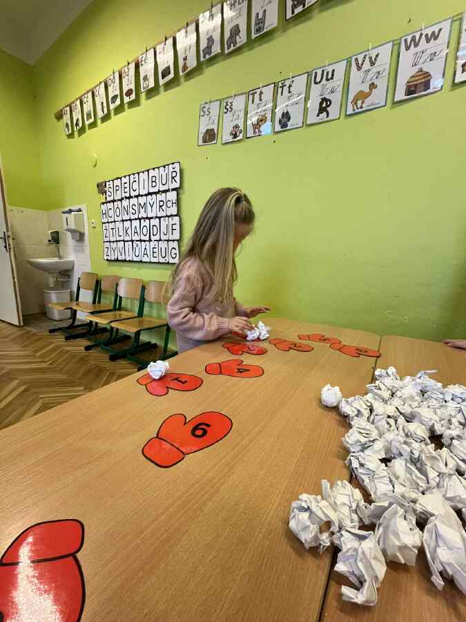 - 1. třída - matematické představy (Děti se připravovaly na pořádnou koulovačku. K rukavicím, na kterých byl zadán počet, přiřazovaly správný počet papírových koulí.)