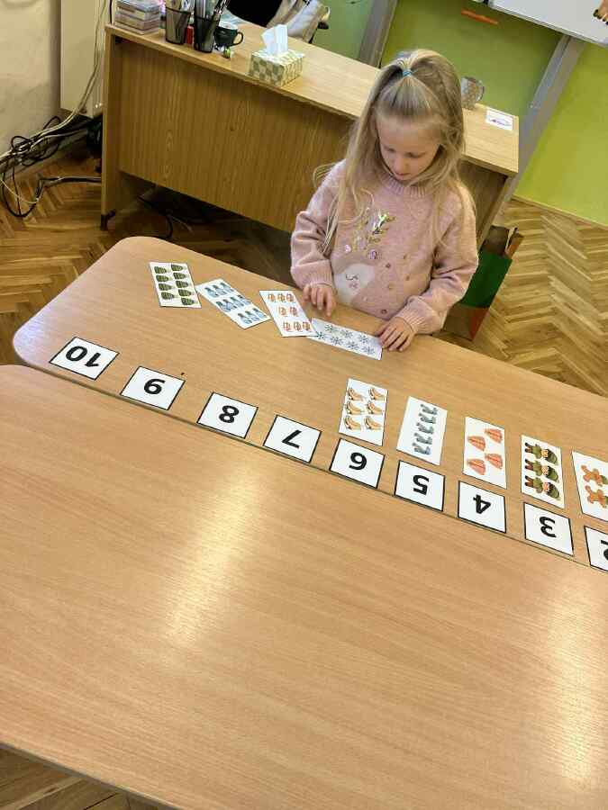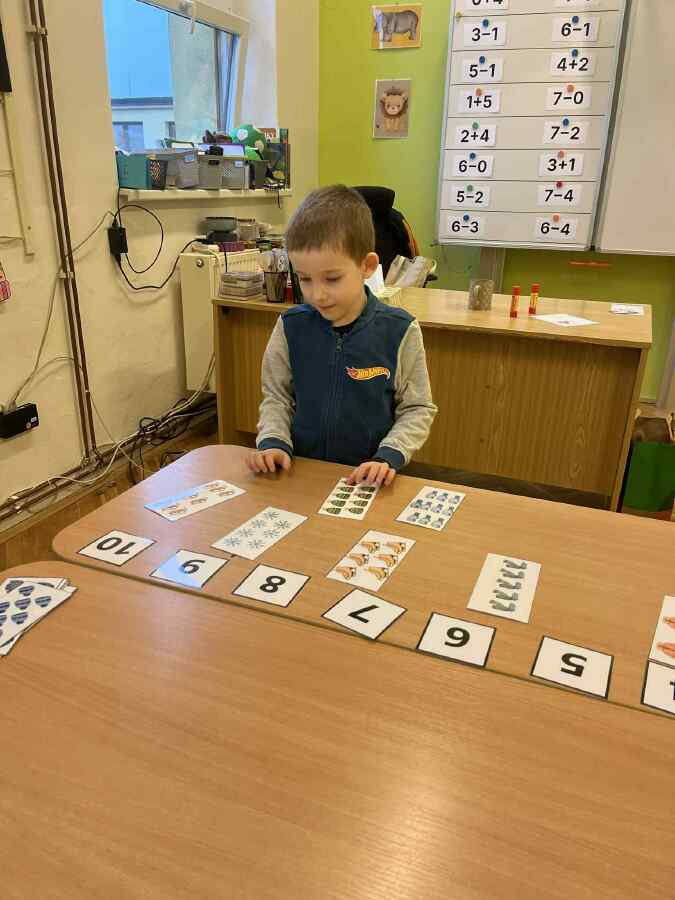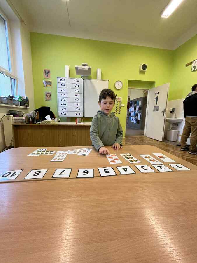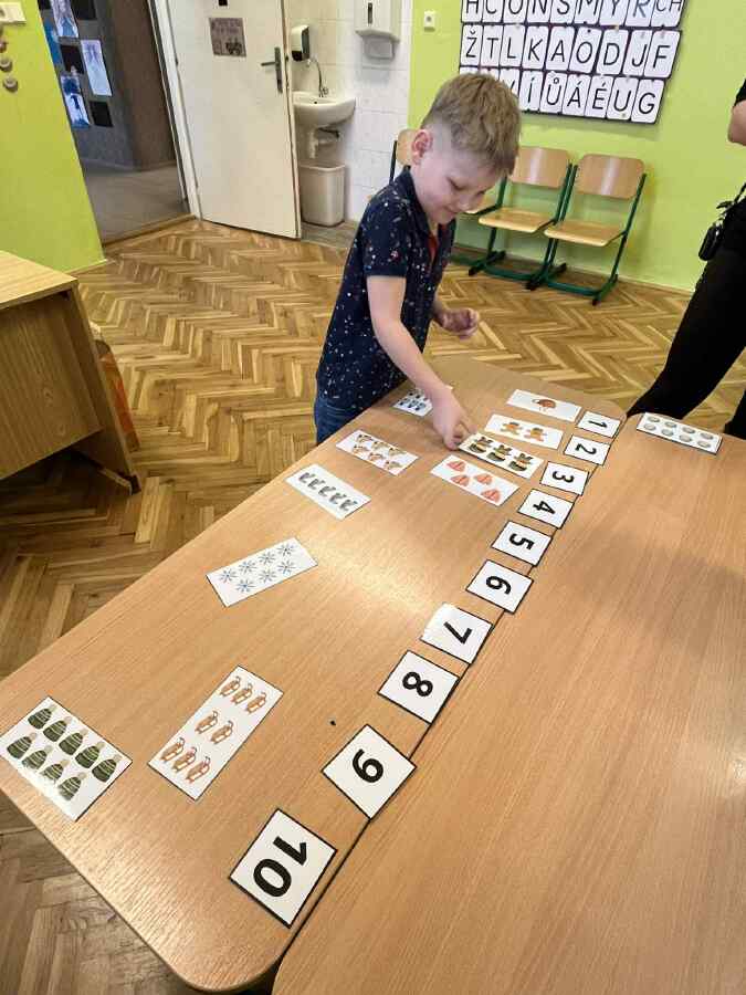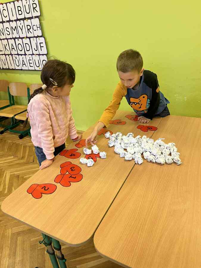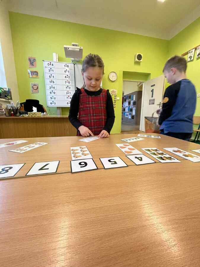 - 1. třída - matematické představy (Děti se připravovaly na pořádnou koulovačku. K rukavicím, na kterých byl zadán počet, přiřazovaly správný počet papírových koulí.)