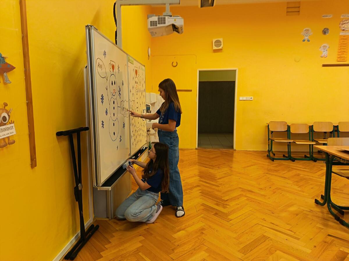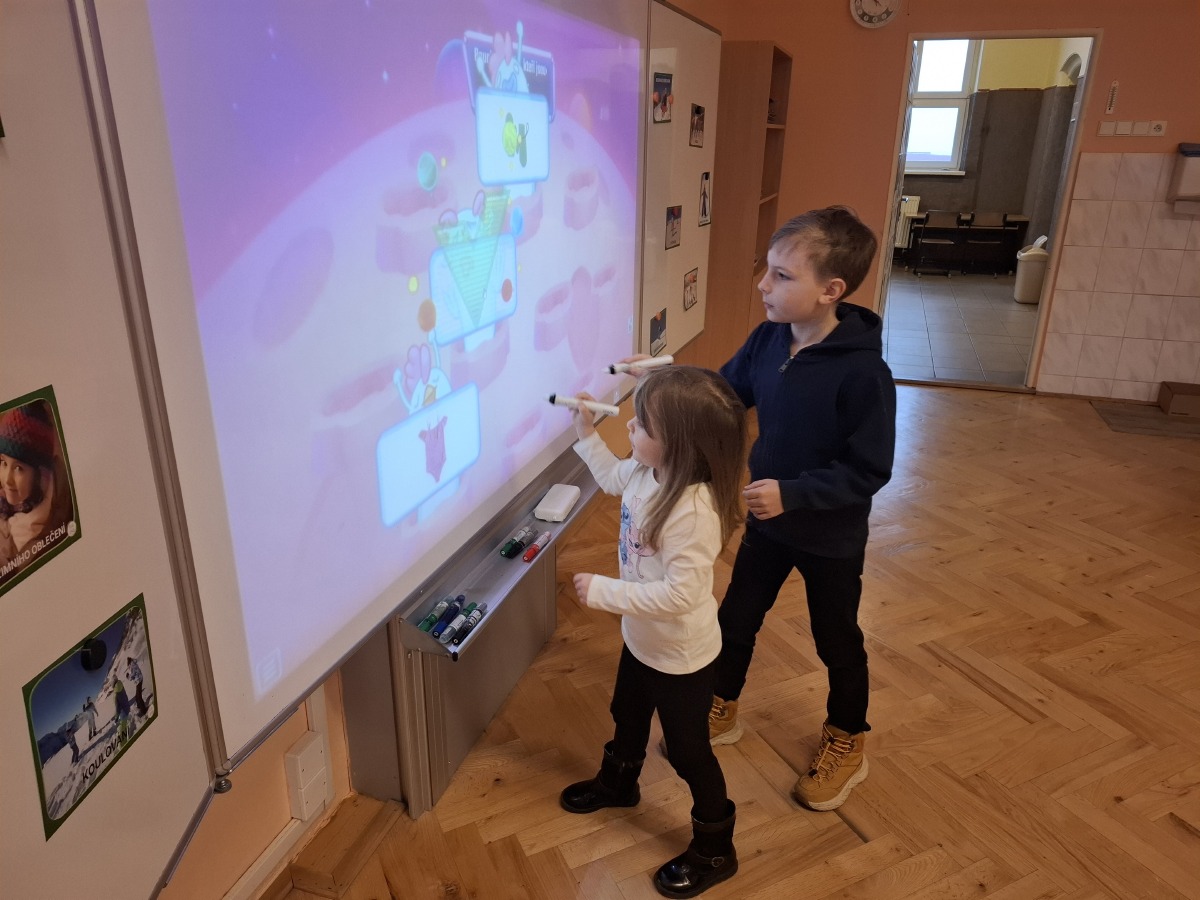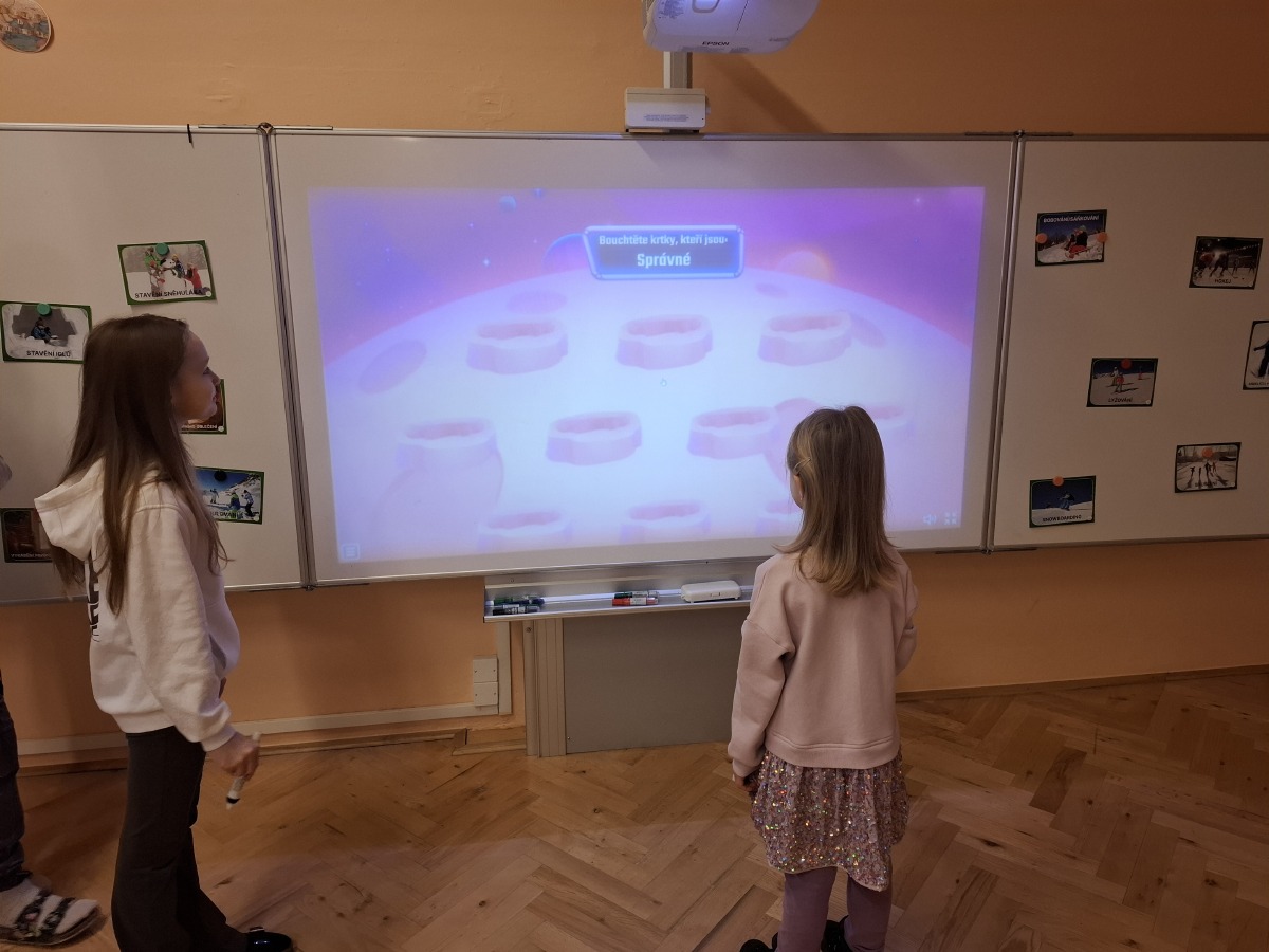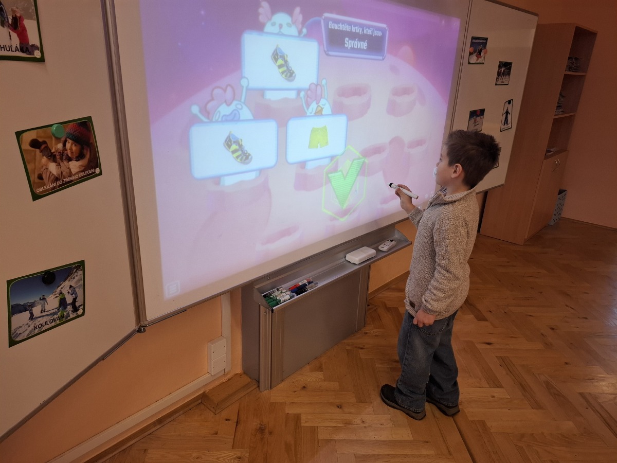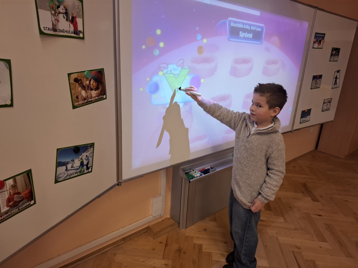 - 5. třída - aktivity na interaktivní tabuli (Děti hledaly ke sněhulákům jejich správné stíny nebo vybíraly správné oblečení na zimní radovánky.)