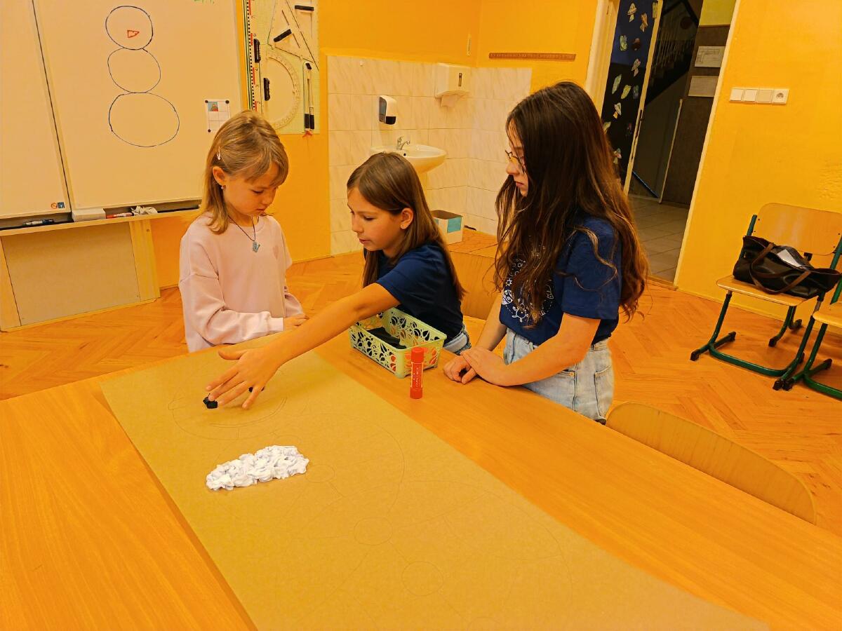 - 4. B - jemná motorika (Děti se podílely na společné tvorbě velkého sněhuláka. Mačkáním krepového papíru každé dítě vyplnilo připravenou část na sněhulákovi. Po dokončení sněhuláka bude výtvor předán dětem zpátky do školky, aby jim připomínal tento významný den.)