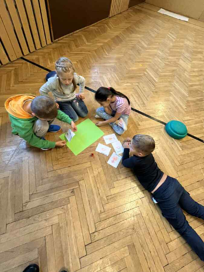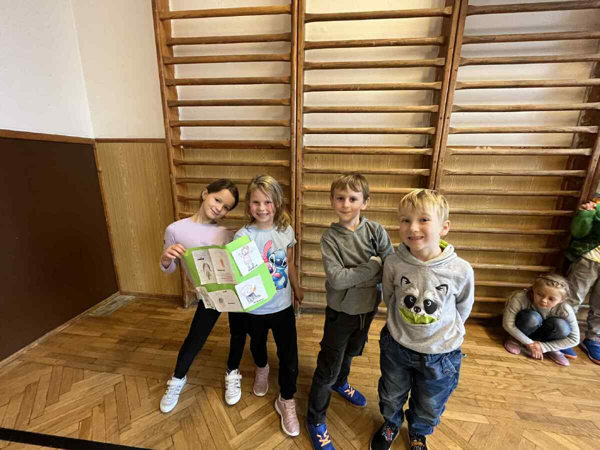 Prvňáci si vyzkoušeli první velkou skupinovou práci. Děti měly nejprve při výtvarné výchově za úkol kreslit obrázky, které vyjadřují slova začínající písmenem M. Ve skupinách pak jednotlivé obrázky pojmenovávaly a třídily do skupin. Výsledkem je Pojmová mapa se čtyřmi rameny - lidé, jídlo, věci a zvířata.
