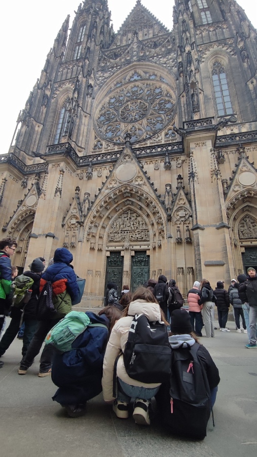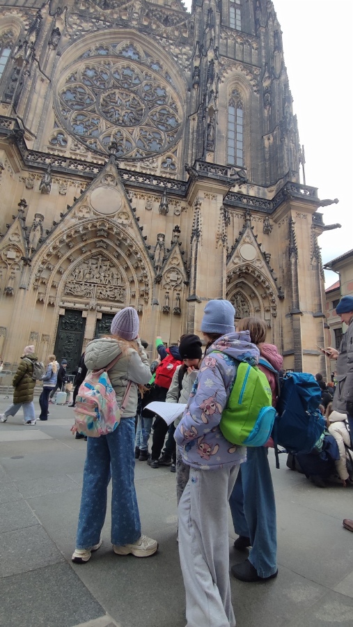 Po obědovém občerstvení jsme vyběhli Zámecké schody a protože bylo zrovna poledne, slyšeli jsme hrát hradní kapelu a viděli jsme střídání hradní stráže. Pak už nás čekala poslední část exkurze - prohlídka Pražského hradu a chrámu sv. Víta. Také jsme se podívali na baziliku sv. Jiří a popovídali jsme si o střídání stavebních slohů a jejich typických znacích. Ty jsme průběžně během exkurze sledovali, poznávali a tipovali, z jakého století jsou. Splnili jsme také další úkoly v našem pracovním listu.