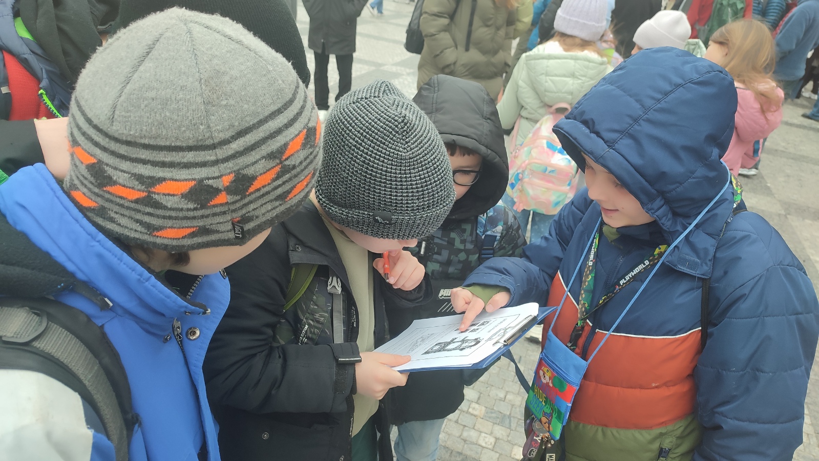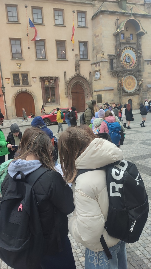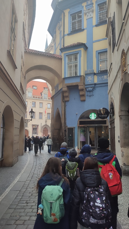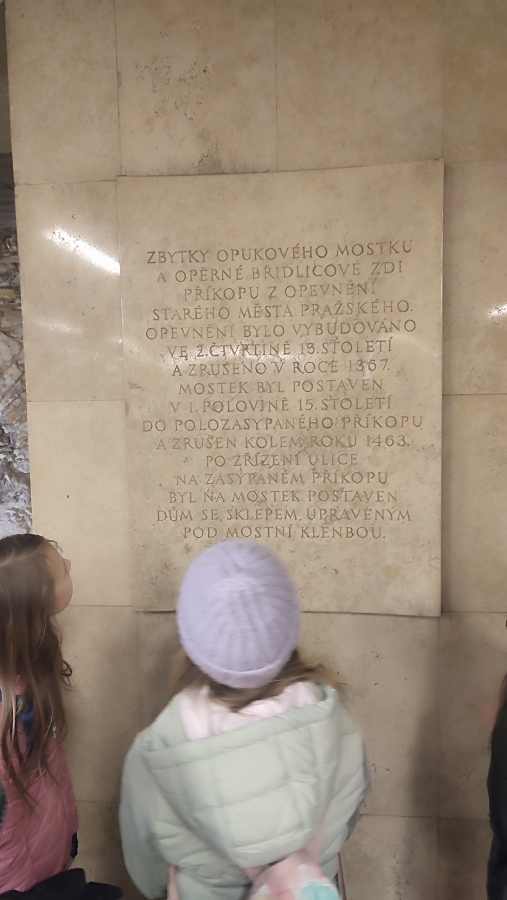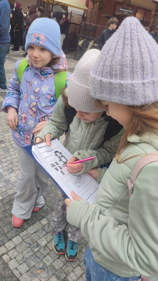 O Praze už jsme lecos věděli z hodin vlastivědy a českého jazyka. Proto jsme přímo v centru hlavního města mohli pokračovat v našem objevování neznámého. Na Můstku jsme si prohlédli pozůstatky středověkého mostku a opevnění ze 13. století. Poznali jsme historii ulic Na Příkopě a Rytířské a zkusili jsme si představit, jak zde probíhaly rytířské turnaje. U staroměstského orloje jsme splnili první úkol v pracovním listu, seznámili se s pověstí o mistru Hanušovi a prohlédli si apoštoly a kostlivce v akci.