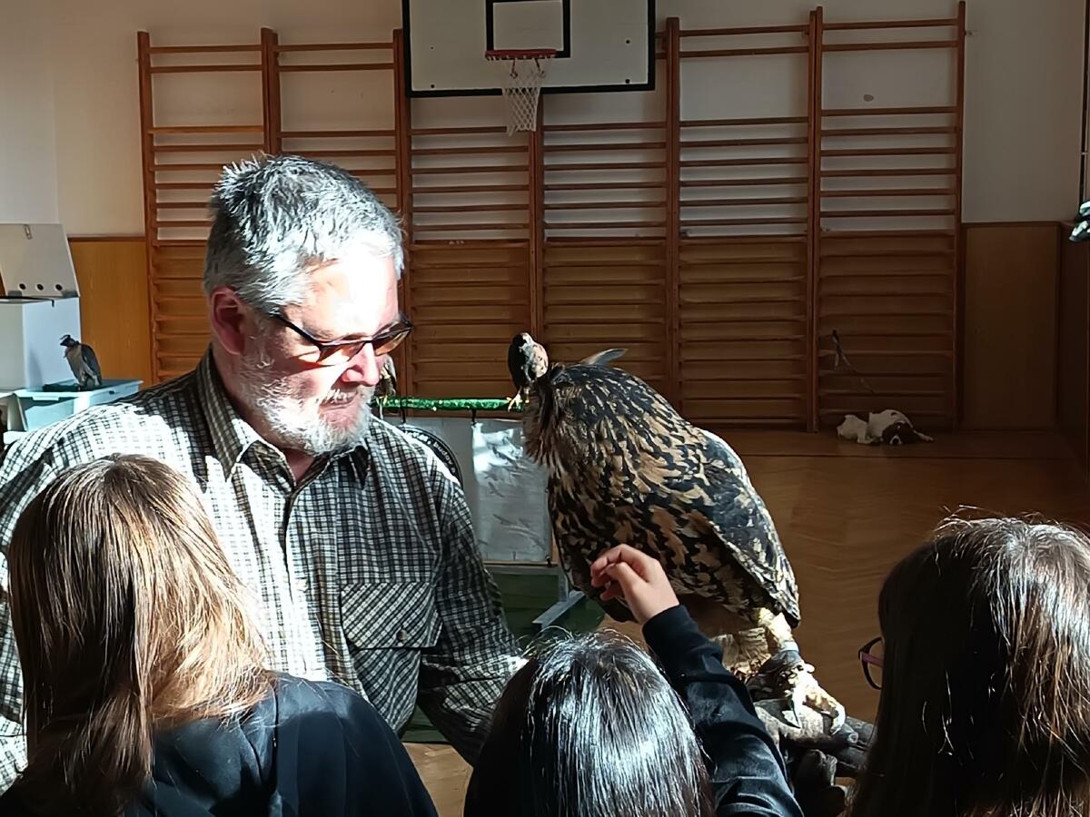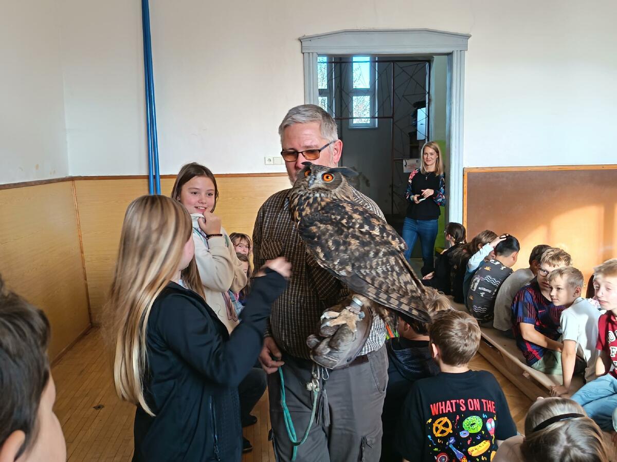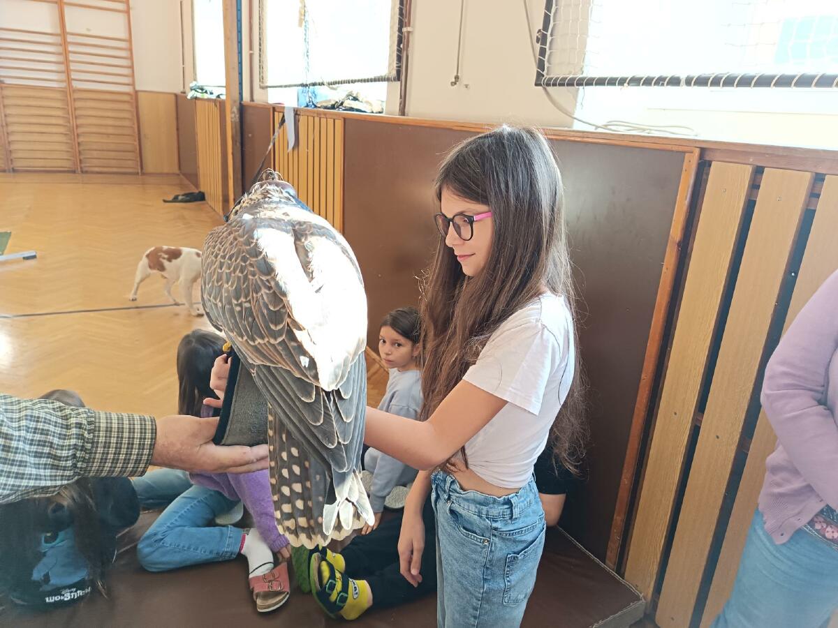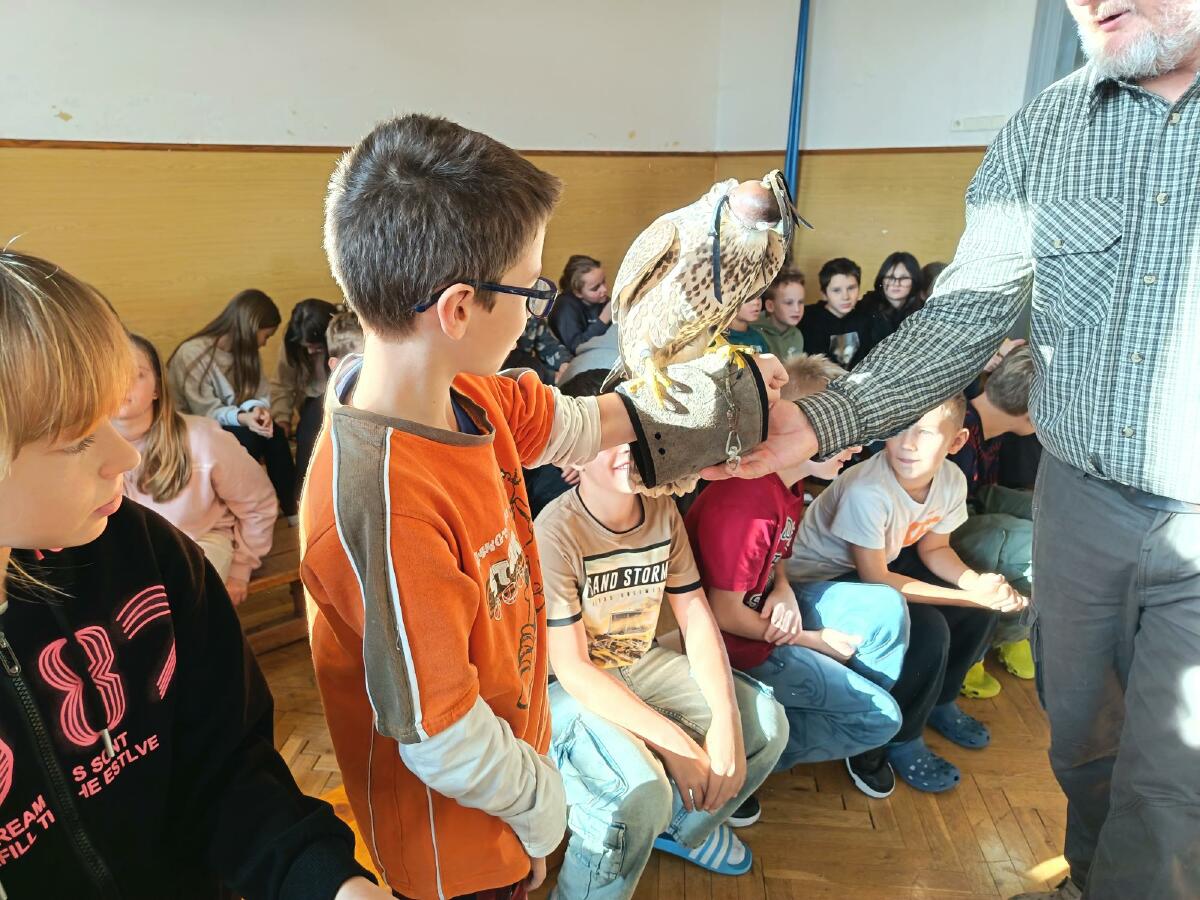 Programy se zvířaty mají vždy u žáků velký úspěch. Proto ani tento program nezklamal. Zájemci si mohli dravce vzít na ruku a pohladit si všemu přihlížející fenku.
