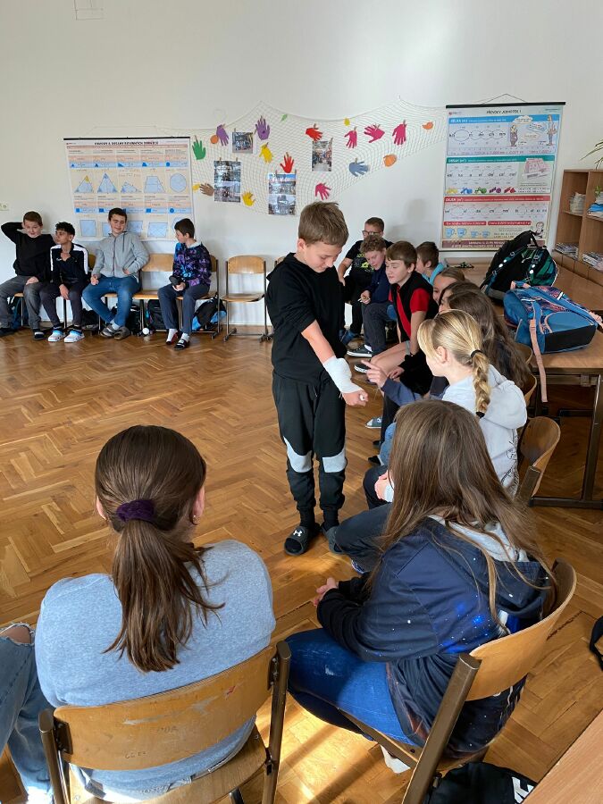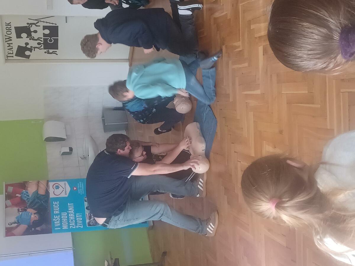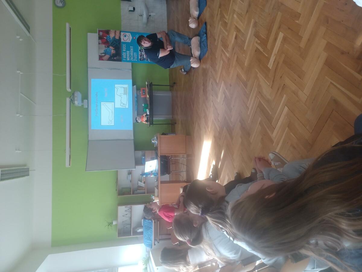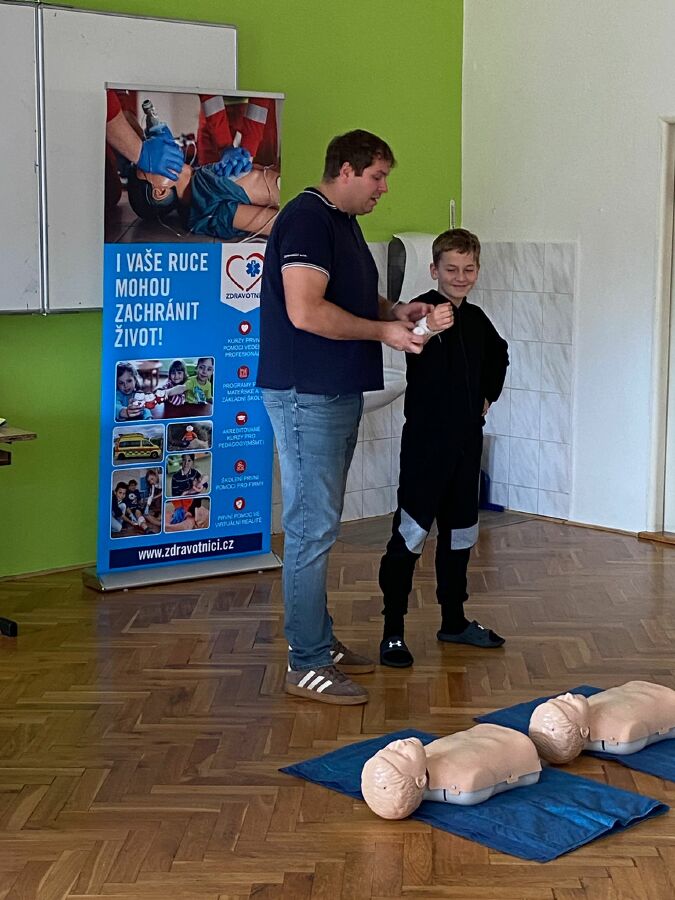 V první části jsme se věnovali teorii – dozvěděli jsme se, jak volat na tísňovou linku, jak poskytnout první pomoc a co dělat, když se někdo ocitne v ohrožení života, procvičili jsme si také základy resuscitace. Ve druhé části, která byla více praktická, jsme si prohlédli sanitku, její vybavení a vyzkoušeli, jak volat na linku první pomoci a jak ošetřit otevřenou zlomeninu.