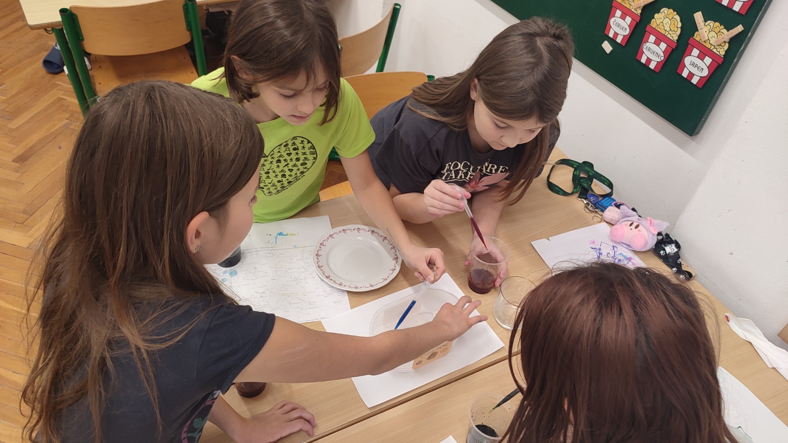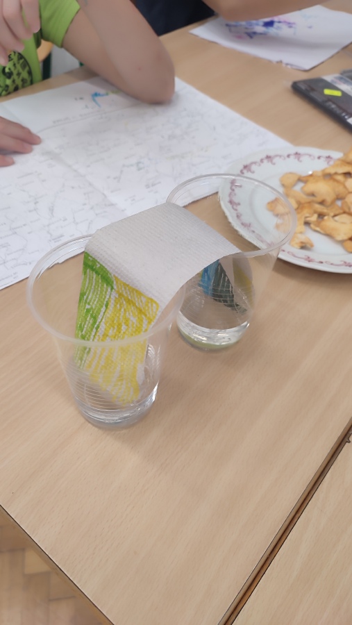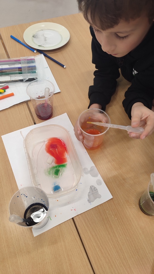 A protože podzim hýří barvami, první listopadové setkání bylo skutečně barevné - dozvěděli jsme se o vzlínavosti vody, rozpouštěli jsme barvy ve vodě a v cukerném roztoku a rozkládali jsme zelenou a oranžovou barvu. Už se těšíme na příští týden a další bádání.