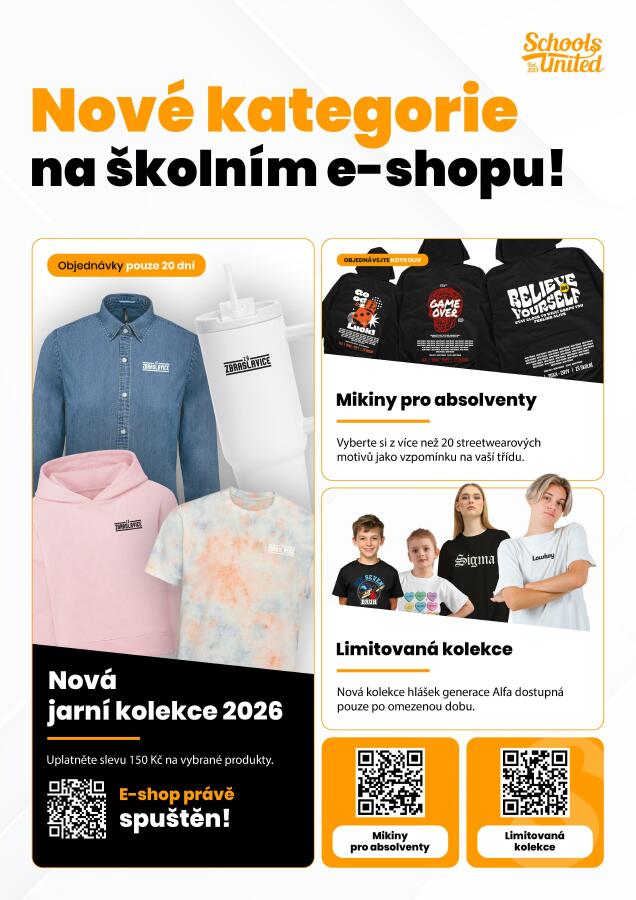 S radostí oznamujeme, že byl spuštěn školní e-shop naší školy, kde si můžete zakoupit oblečení a další produkty s motivem školy.