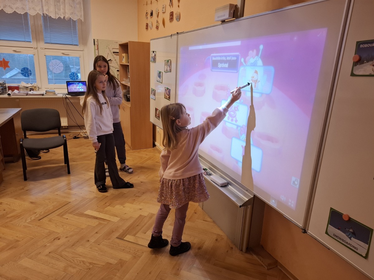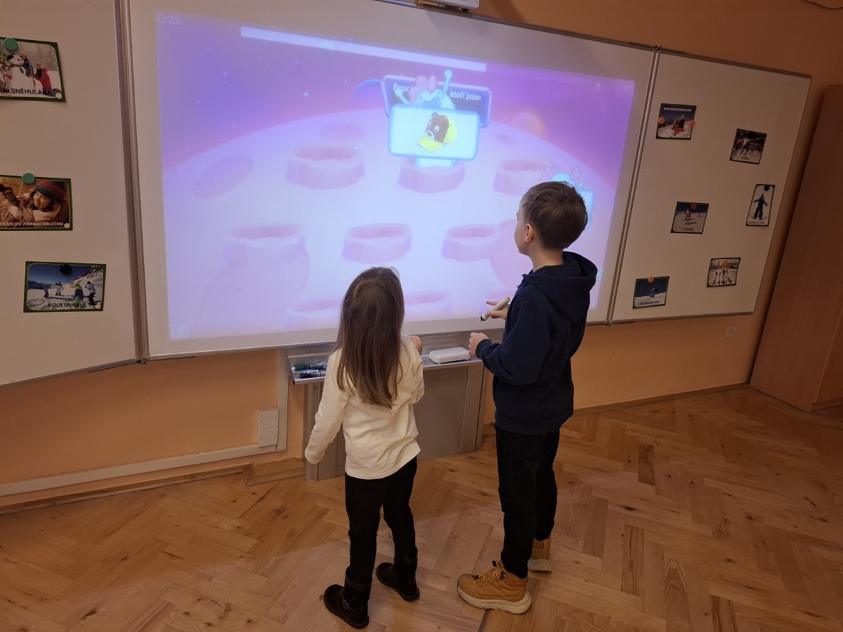 - 5. třída - aktivity na interaktivní tabuli (Děti hledaly ke sněhulákům jejich správné stíny nebo vybíraly správné oblečení na zimní radovánky.)