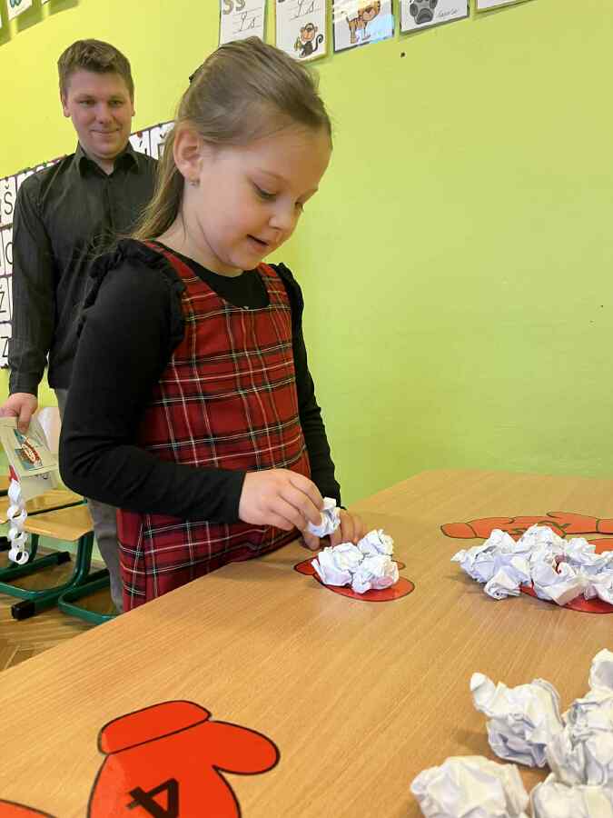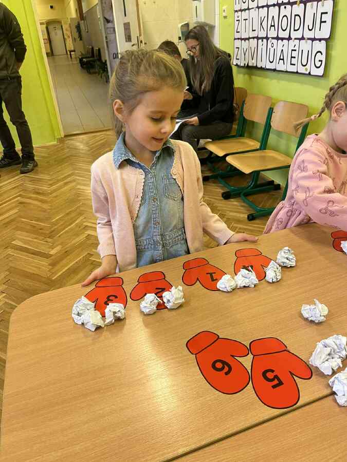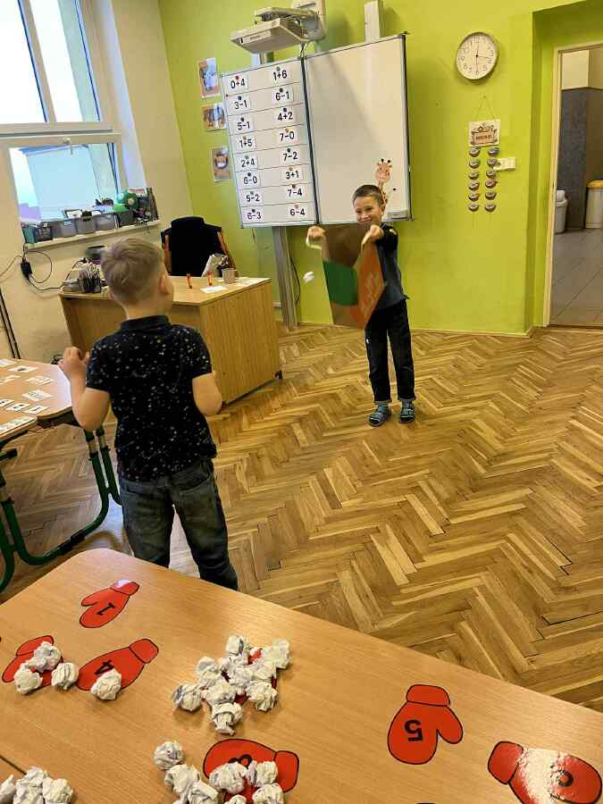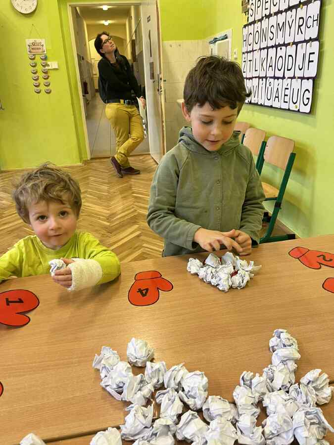 - 1. třída - matematické představy (Děti se připravovaly na pořádnou koulovačku. K rukavicím, na kterých byl zadán počet, přiřazovaly správný počet papírových koulí.)