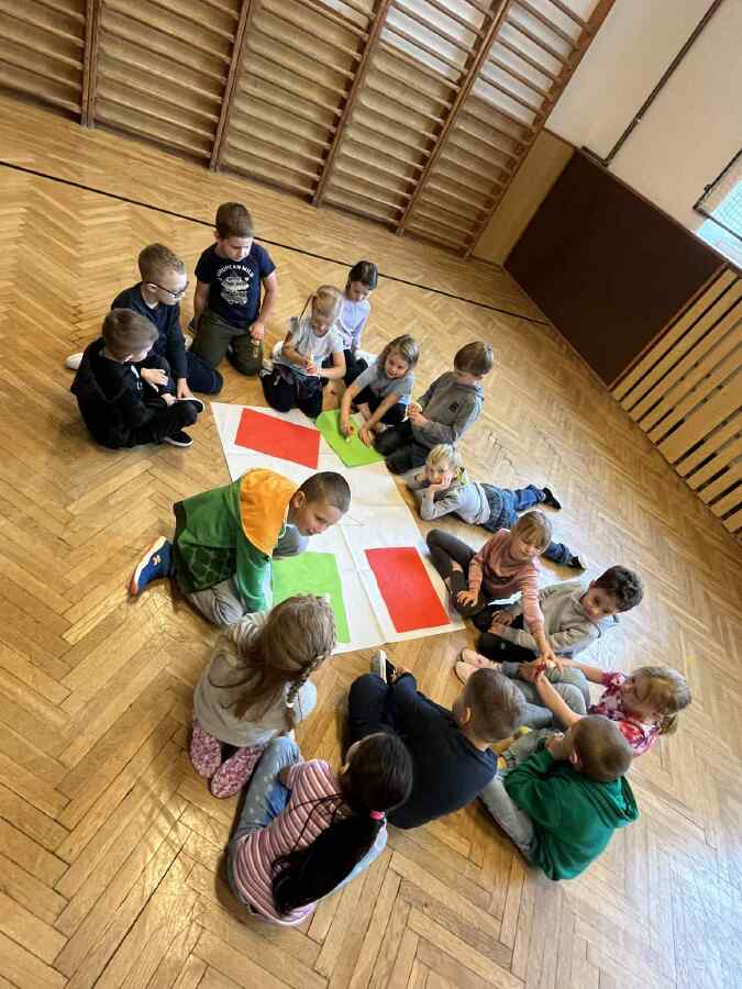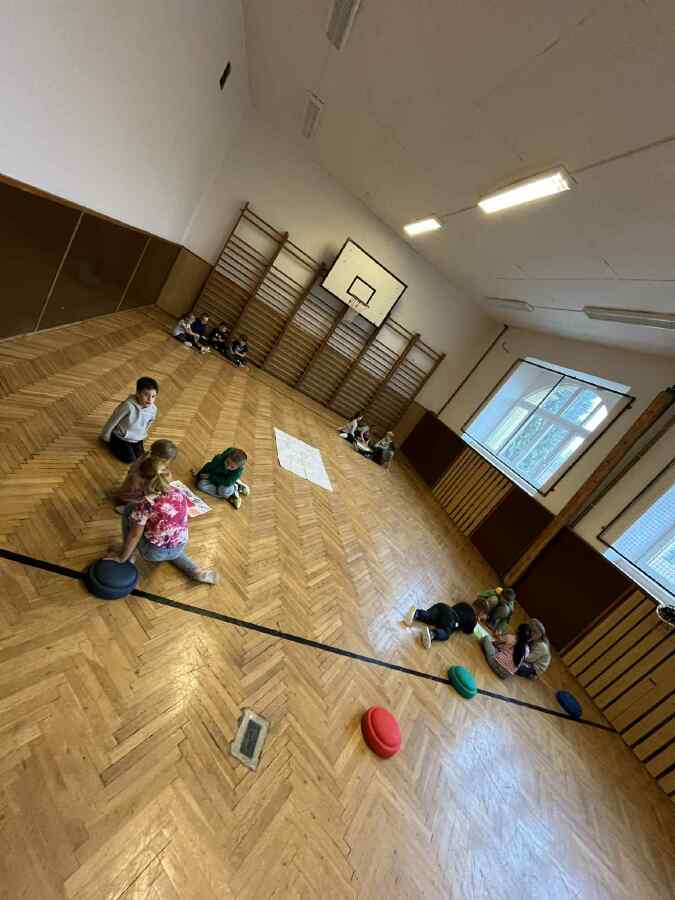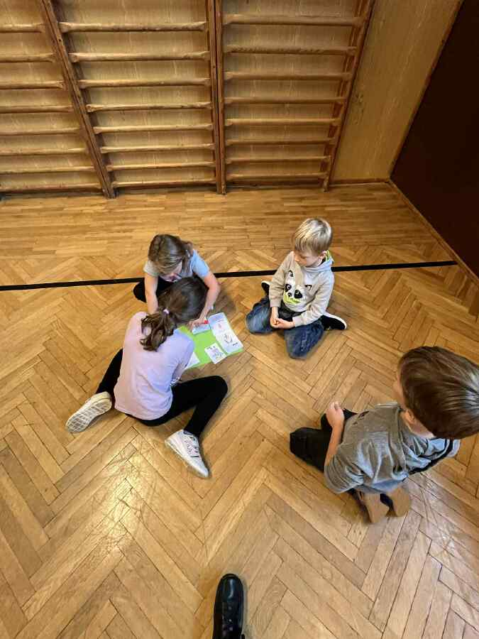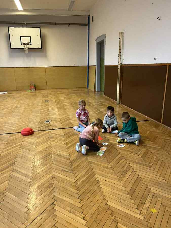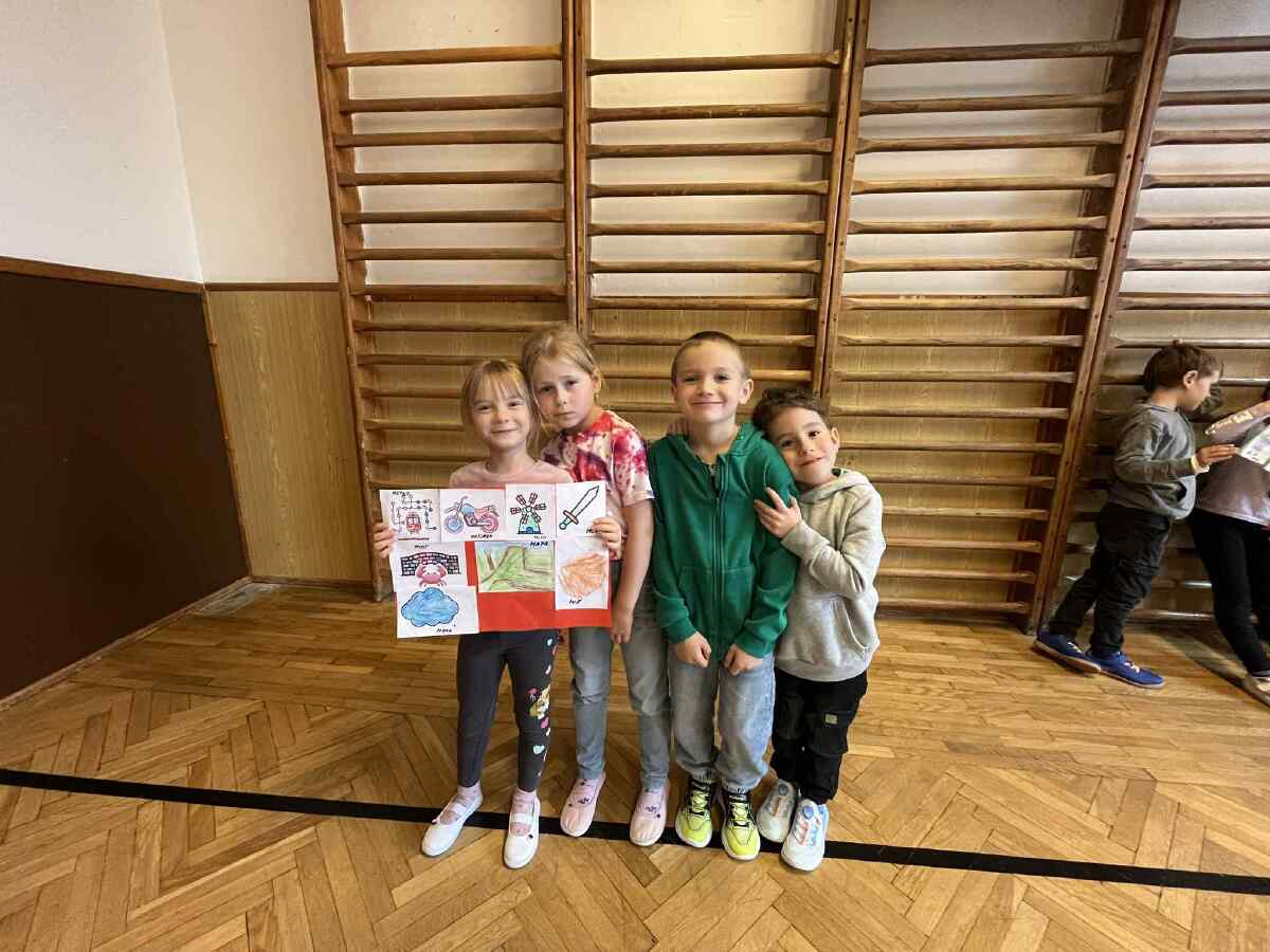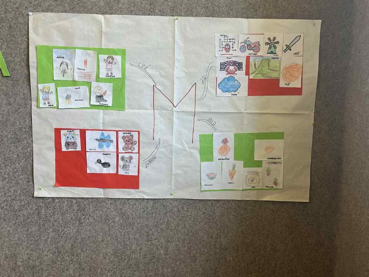 Prvňáci si vyzkoušeli první velkou skupinovou práci. Děti měly nejprve při výtvarné výchově za úkol kreslit obrázky, které vyjadřují slova začínající písmenem M. Ve skupinách pak jednotlivé obrázky pojmenovávaly a třídily do skupin. Výsledkem je Pojmová mapa se čtyřmi rameny - lidé, jídlo, věci a zvířata.