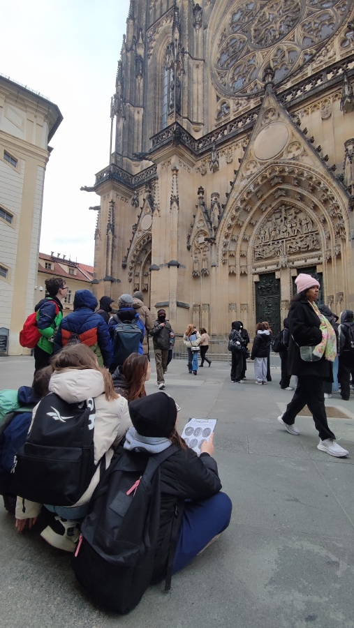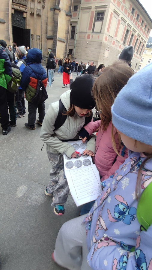 Po obědovém občerstvení jsme vyběhli Zámecké schody a protože bylo zrovna poledne, slyšeli jsme hrát hradní kapelu a viděli jsme střídání hradní stráže. Pak už nás čekala poslední část exkurze - prohlídka Pražského hradu a chrámu sv. Víta. Také jsme se podívali na baziliku sv. Jiří a popovídali jsme si o střídání stavebních slohů a jejich typických znacích. Ty jsme průběžně během exkurze sledovali, poznávali a tipovali, z jakého století jsou. Splnili jsme také další úkoly v našem pracovním listu.