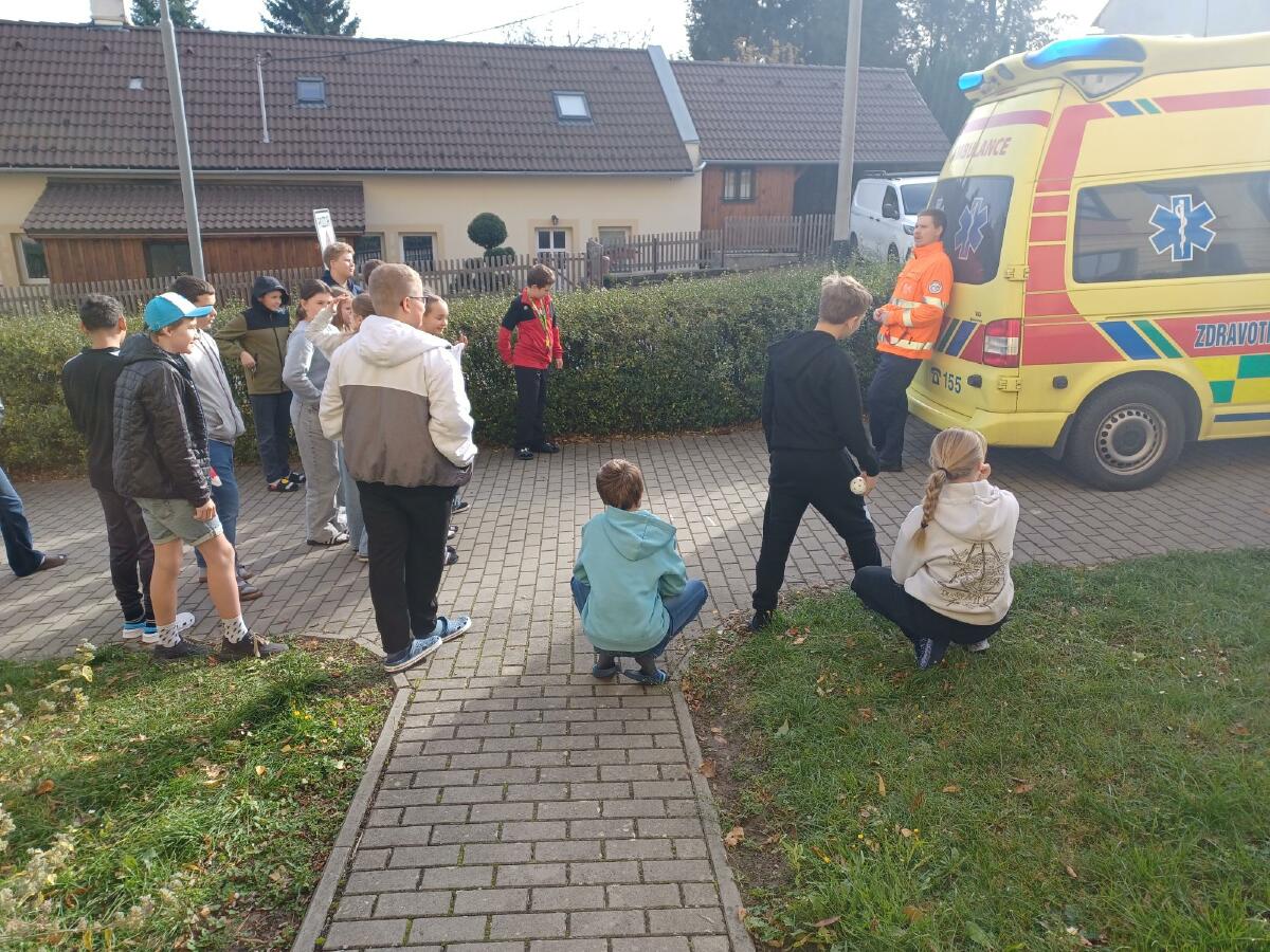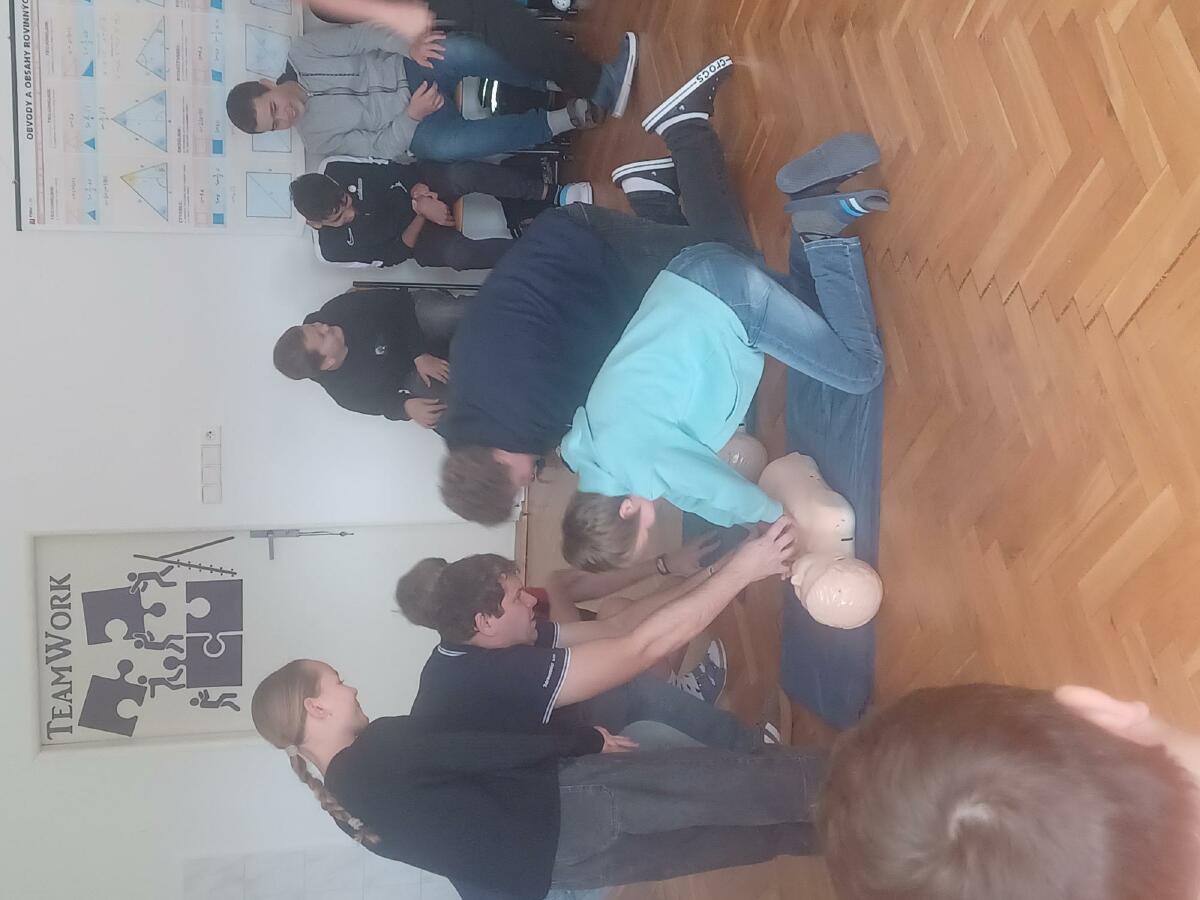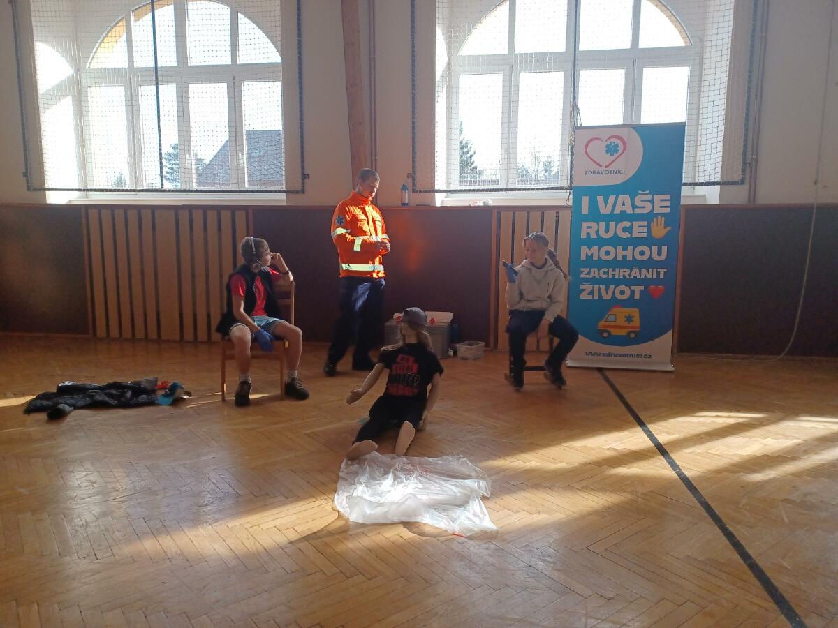 V první části jsme se věnovali teorii – dozvěděli jsme se, jak volat na tísňovou linku, jak poskytnout první pomoc a co dělat, když se někdo ocitne v ohrožení života, procvičili jsme si také základy resuscitace. Ve druhé části, která byla více praktická, jsme si prohlédli sanitku, její vybavení a vyzkoušeli, jak volat na linku první pomoci a jak ošetřit otevřenou zlomeninu.
