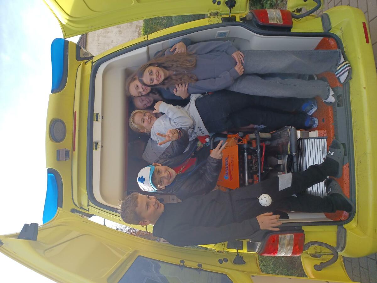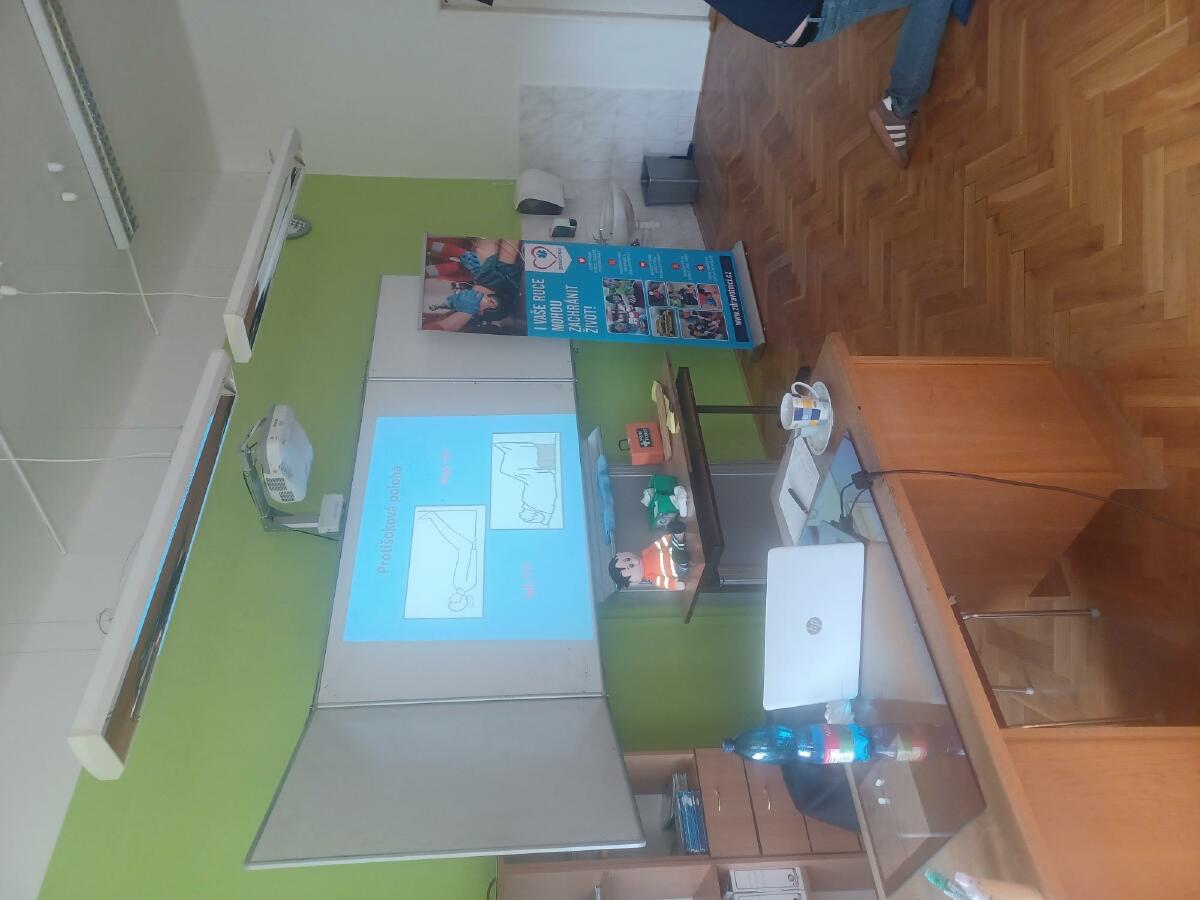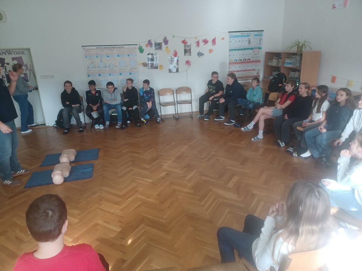 V první části jsme se věnovali teorii – dozvěděli jsme se, jak volat na tísňovou linku, jak poskytnout první pomoc a co dělat, když se někdo ocitne v ohrožení života, procvičili jsme si také základy resuscitace. Ve druhé části, která byla více praktická, jsme si prohlédli sanitku, její vybavení a vyzkoušeli, jak volat na linku první pomoci a jak ošetřit otevřenou zlomeninu.