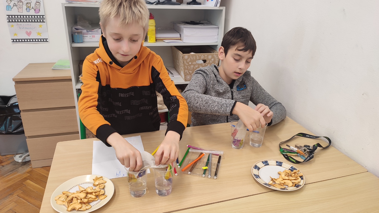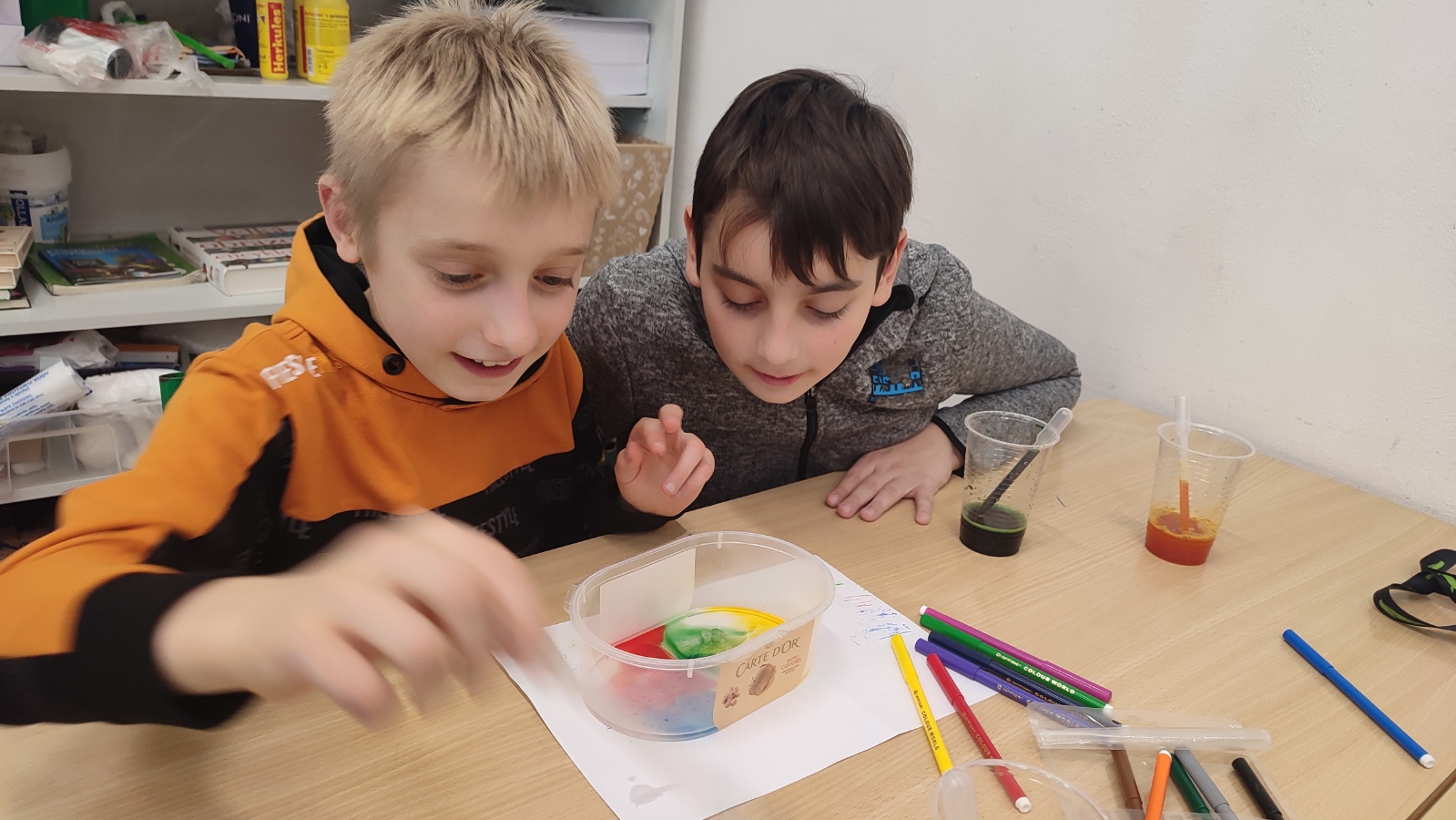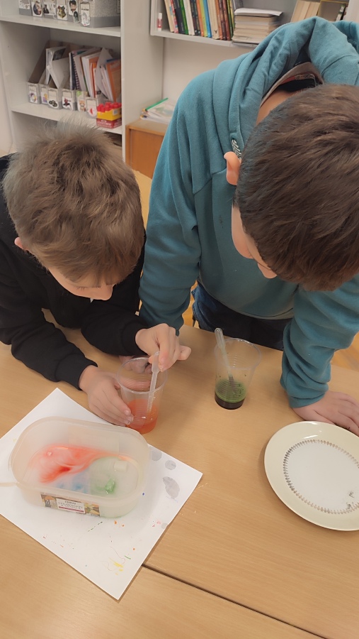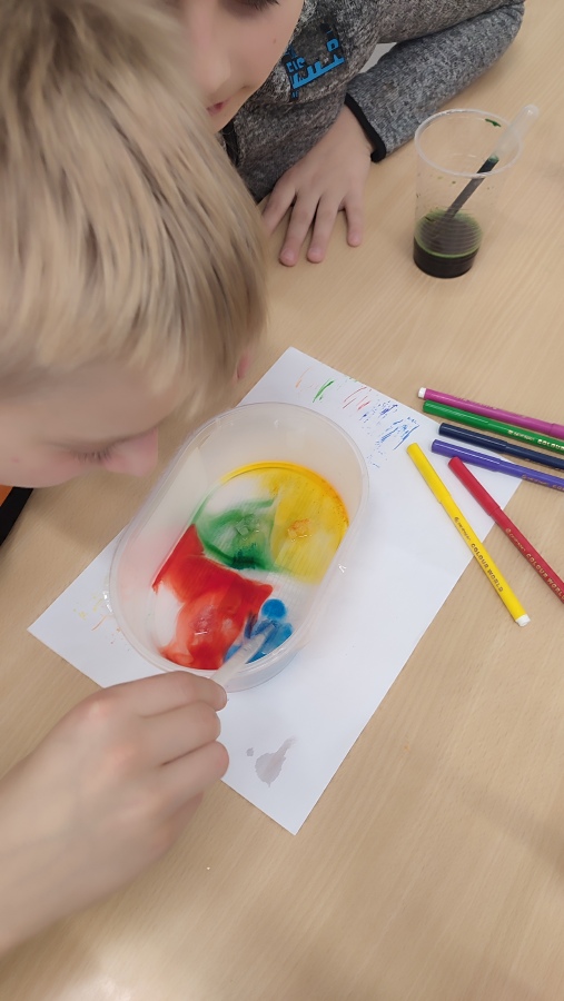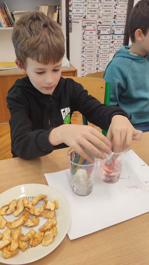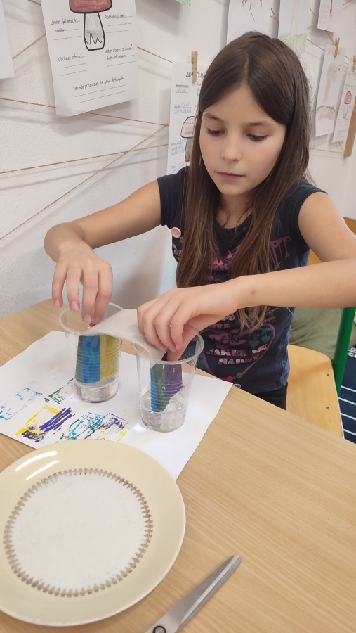 A protože podzim hýří barvami, první listopadové setkání bylo skutečně barevné - dozvěděli jsme se o vzlínavosti vody, rozpouštěli jsme barvy ve vodě a v cukerném roztoku a rozkládali jsme zelenou a oranžovou barvu. Už se těšíme na příští týden a další bádání.